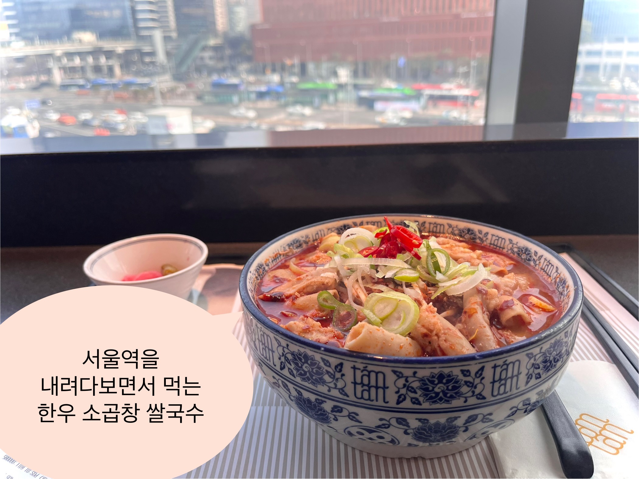 서울역 근처에서 혼밥하기 좋은 곳, 뷰 맛집, 얼큰한 국물 음식을 찾고 있다면, 땀땀 쌀국수의 한우 소곱창 쌀국수를 추천해요.