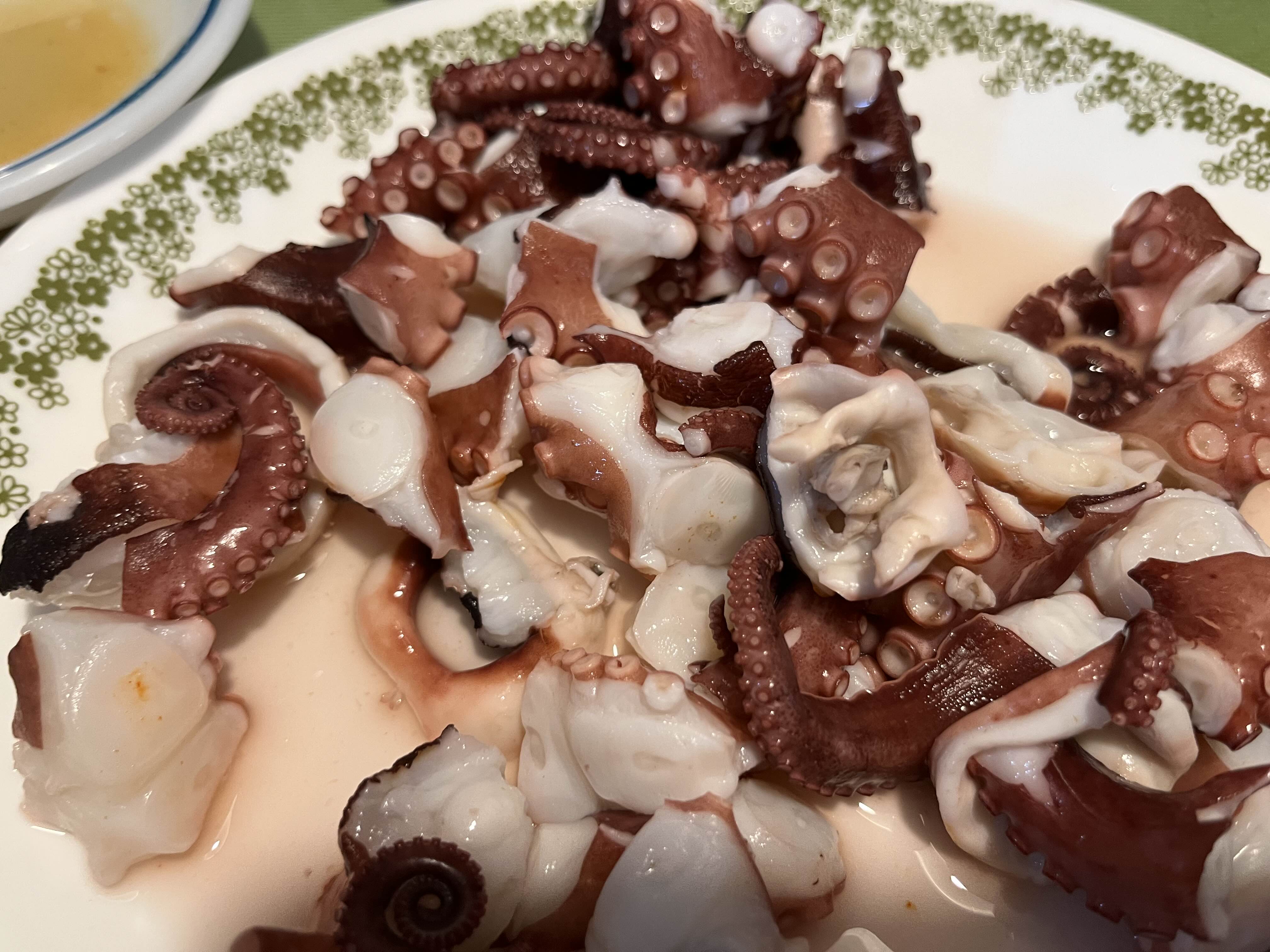 삶은 문어를 적당한 크기로 썰어 초장과 함께 먹으면, 쫄깃하고 부드러운 맛이 일품이에요.