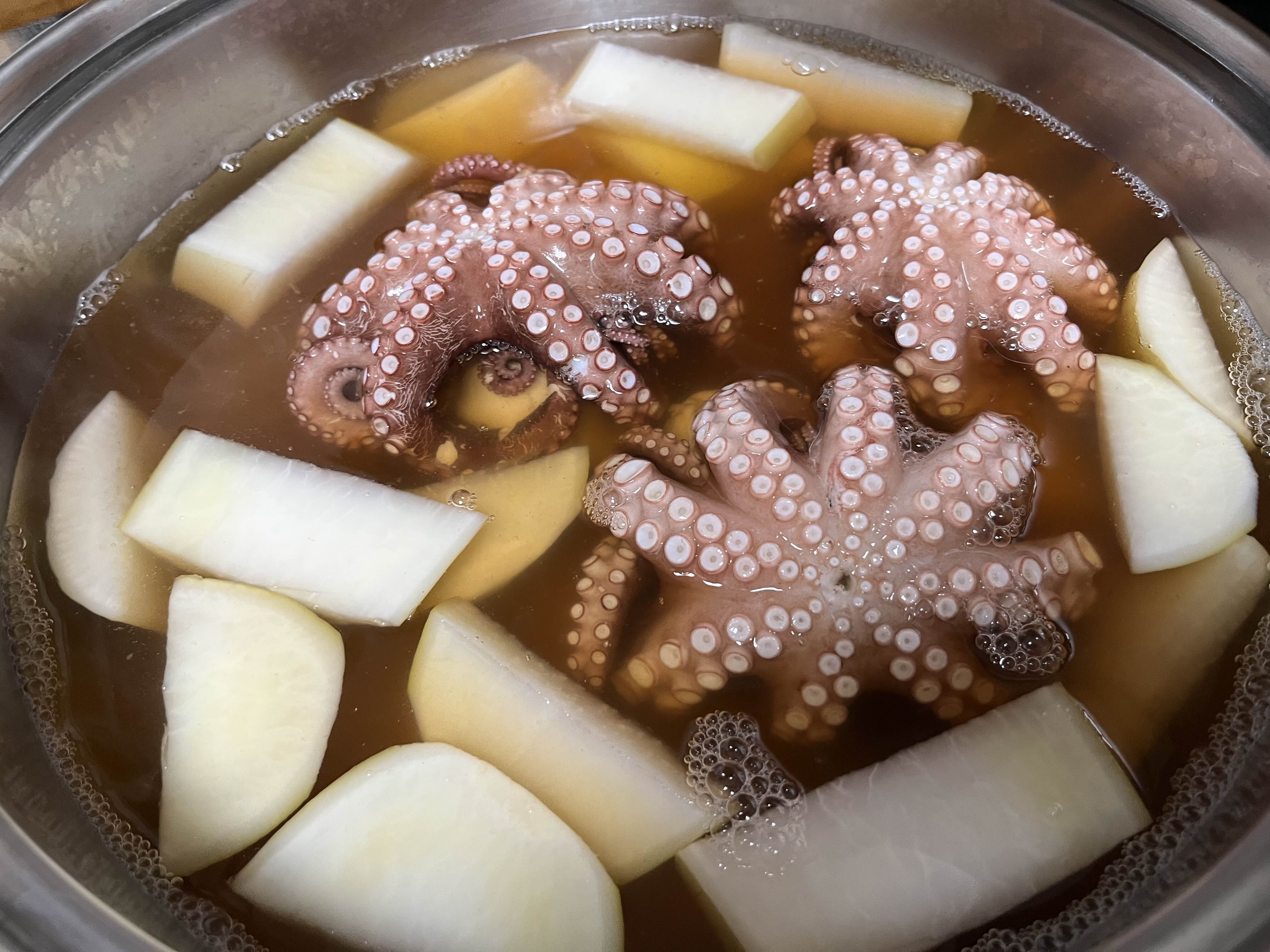 무와 설탕, 식초, 청하를 더해 삶으면 맛도 훌륭하고 잡내 없이 깔끔한 문어 숙회를 완성할 수 있습니다.
