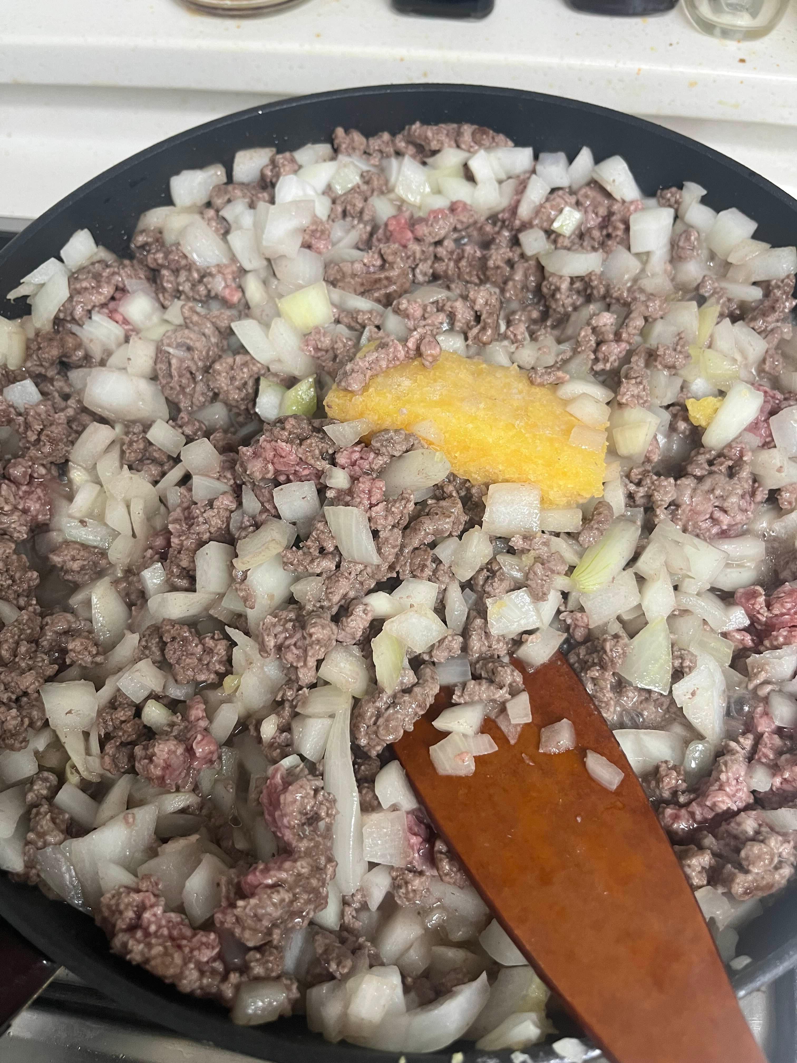 소고기를 후라이팬에 넣고 볶아주세요. 소고기에서 기름이 충분히 나와서 따로 기름을 넣을 필요가 없어요! 💪